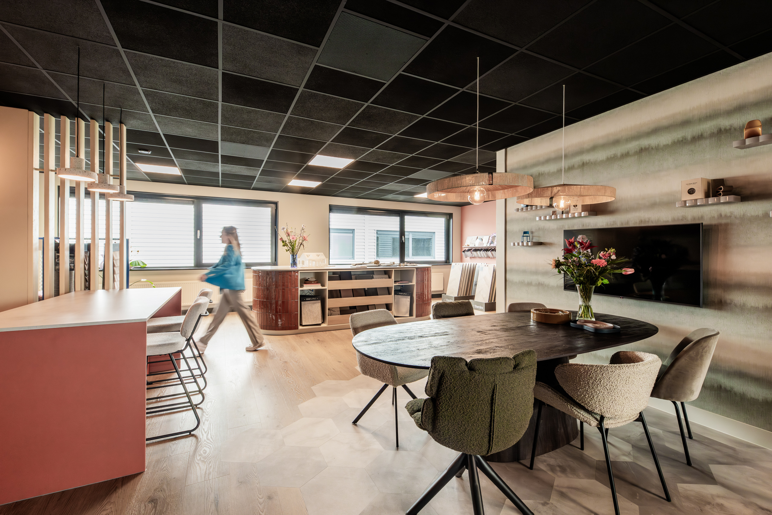 Voor deze vrijstaande woning is een speels en kleurrijk ontwerp gecreëerd. De rustige tegelvloer vormt de basis en biedt ruimte om kleurrijke items toe te voegen. De speelse indeling met een elementenbank zorgt voor een unieke en dynamische sfeer. Door de stalen deuren kunnen de twee zithoeken van elkaar worden gescheiden. Het prachtige maatwerk maakt de woning helemaal af. Zo is één tv-meubel voorzien van een schuifdeur, waardoor de tv uit het zicht blijft en niet direct opvalt bij binnenkomst. Ook is de piano geïntegreerd in de bergkast langs de lange wand.