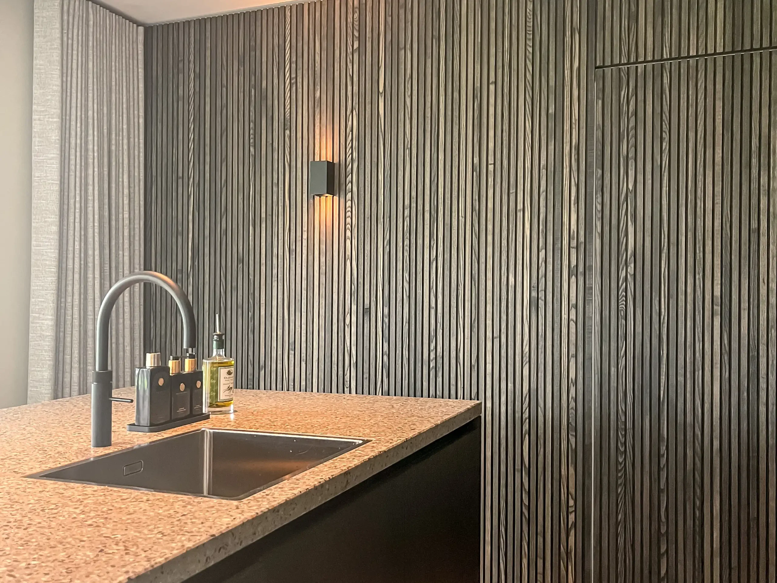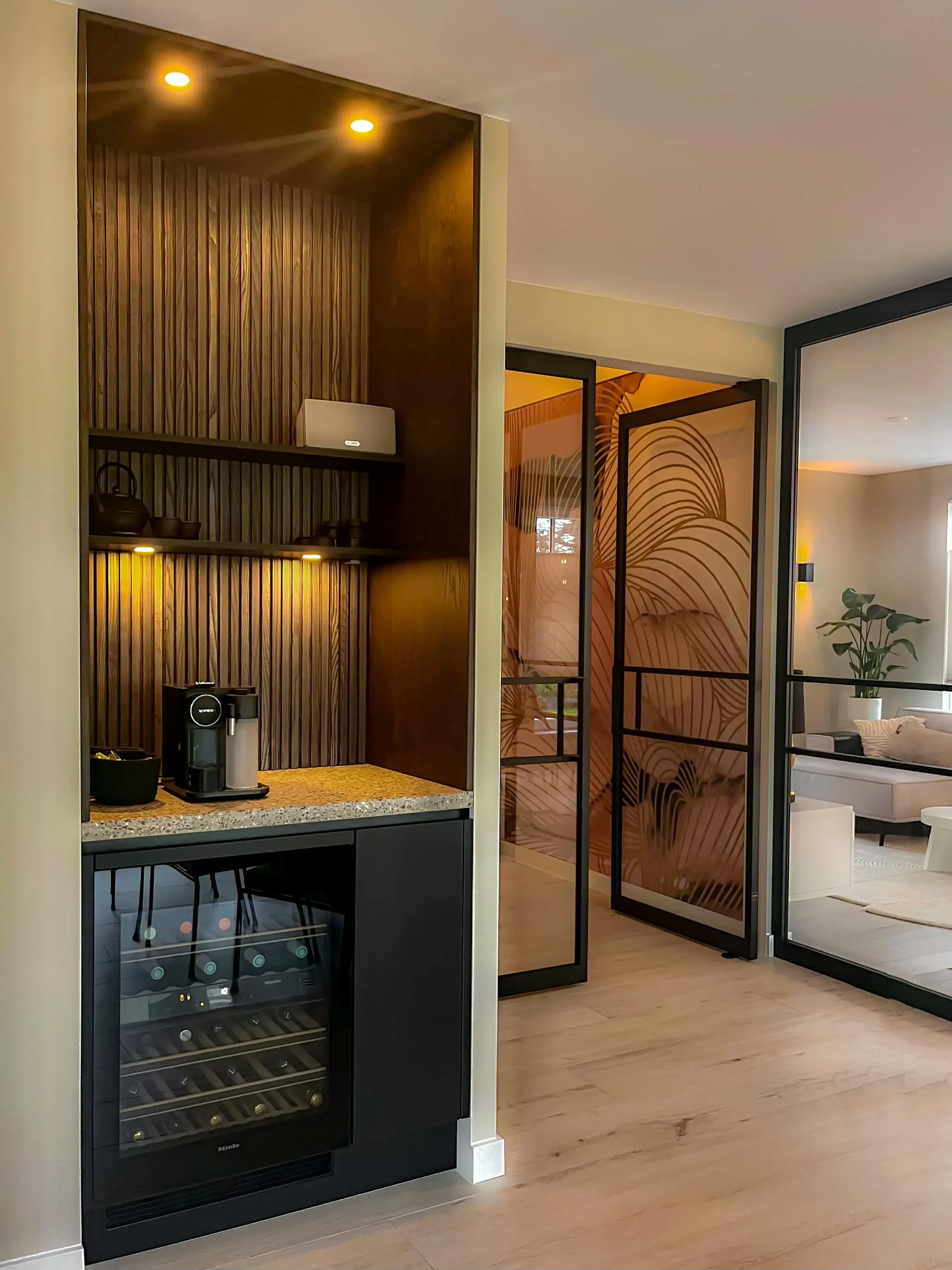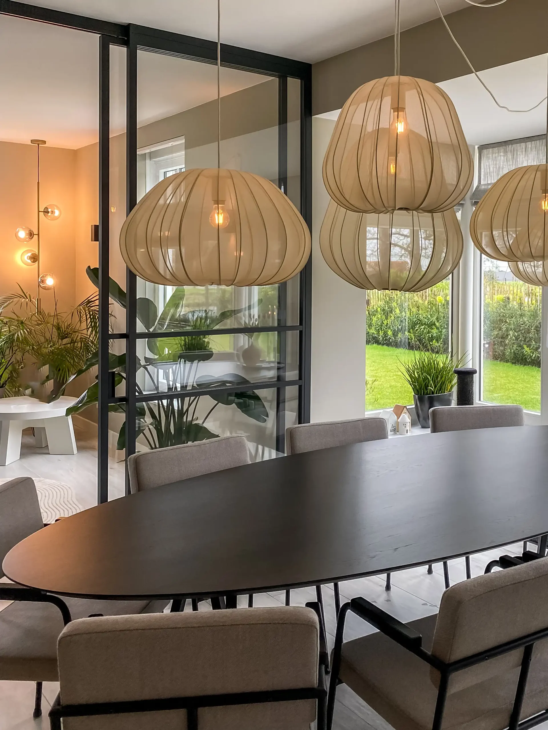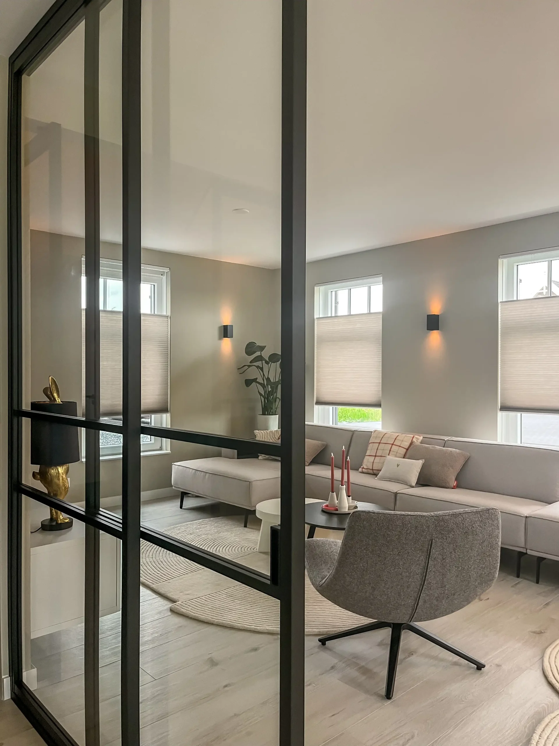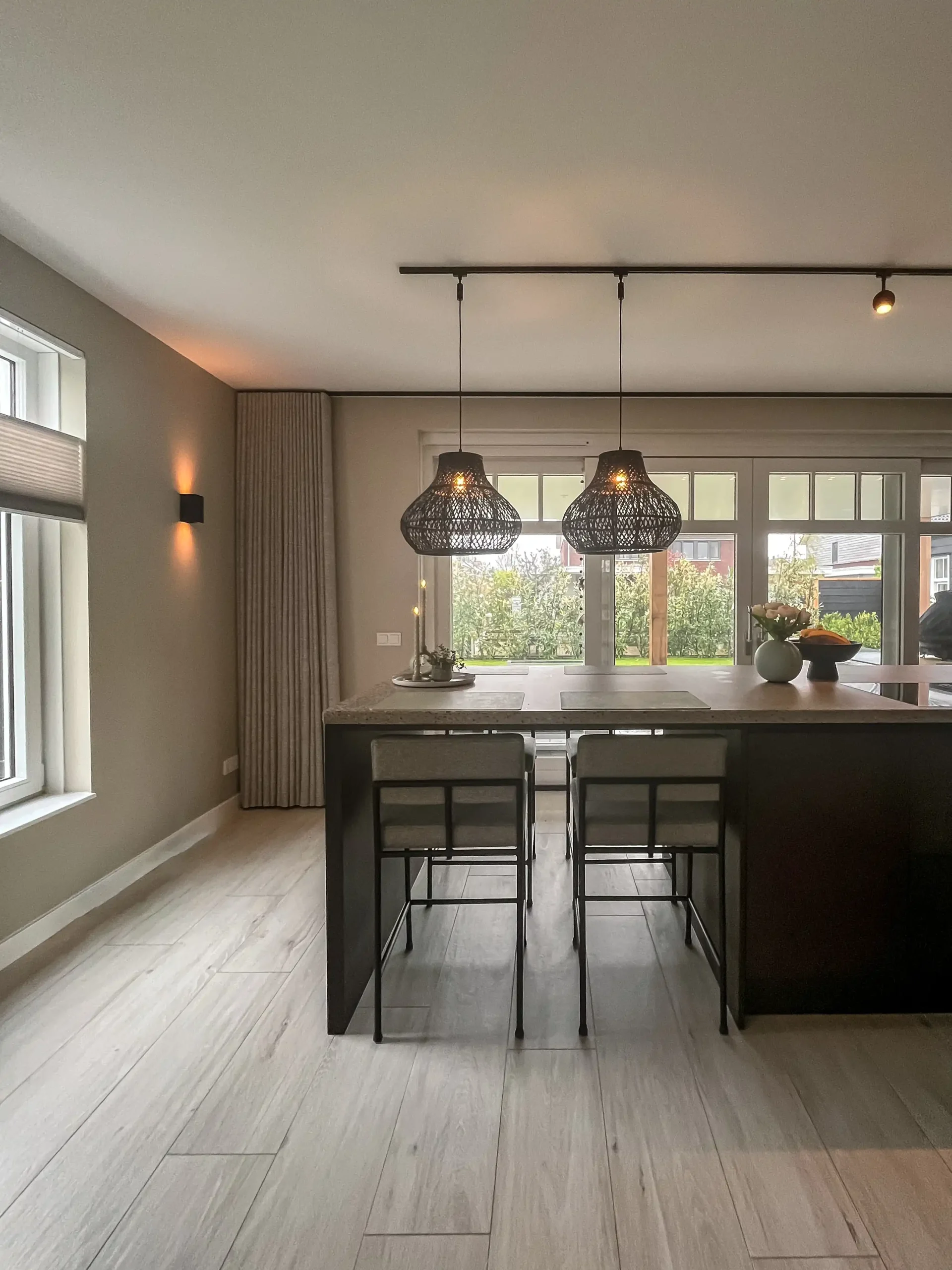 Voor een nieuwbouw familiewoning in Zevenhuizen is een totaalontwerp gemaakt. Voor de gehele begane grond. Een goede indeling vanuit de architect vormde een duidelijk uitgangspunt. Alle ruimtes zijn mooi in evenwicht en opgedeeld in 3 elementen; zitten, tafelen en koken. Na de bepaalde indeling was er een wens voor een stalen pui, donkere keuken, veel verschillende texturen, rustig qua kleur en een lichte basis.